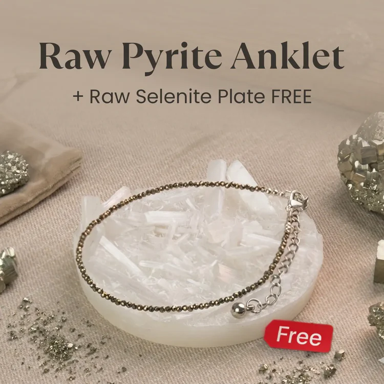 Step into abundance with the Raw Pyrite Anklet, made with 100% raw Pyrite crystals, paired with a FREE Raw Selenite Plate for cleansing and recharging. Known as the Stone of Wealth, Pyrite is believed to support money flow, confidence, and disciplined action. It is also traditionally linked with balancing Shani-related challenges (Shani Dosh) by bringing stability and focus.