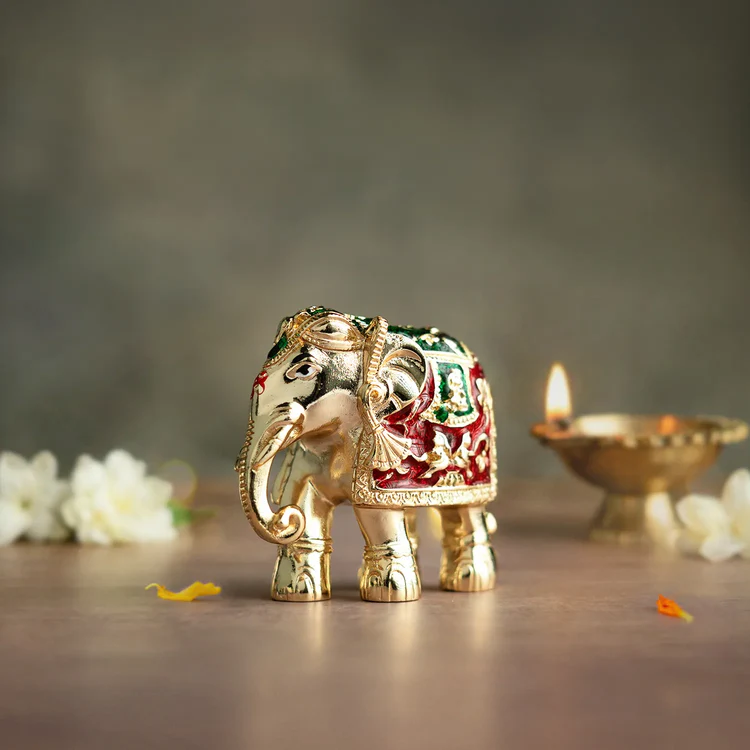 This idol features a downward trunk elephant, known for its calm, grounding energy. It is believed to absorb negativity, balance emotions, and support steady growth. The ornate royal saddle adds a touch of grandeur, symbolizing prosperity and protective energy in both personal and professional life.
